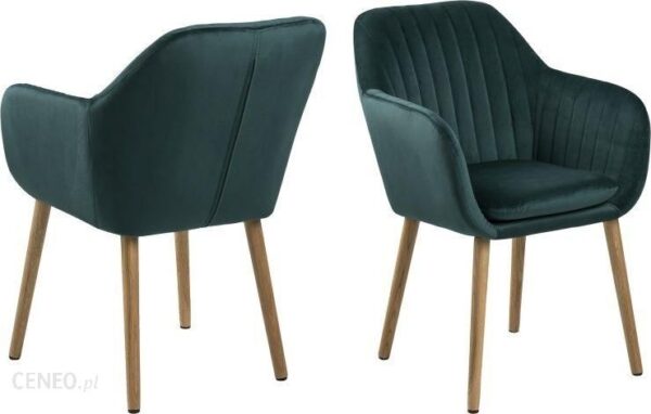 Wygodne tapicerowane krzesło w stylu lat 50-tych do salonu lub jadalni. Krzesło jest obite tkaniną w jasno szarym kolorze. Siedzisko jest wyprofilowane wraz z oparciem i podłokietnikami jako jeden element. Dodatkowo znajduje się na nim wygodna poducha. Na oparciu dodane jest ozdobne pikowanie dwoma guzikami. Wykonaną z drewna dębowego podstawę stanowią toczone nóżki. Nóżki zwężają się u dołu, mają jasny naturalny kolor, a drewno jest zabezpieczona olejem. Kilka krzeseł razem można wstawić do jadalni lub kuchni. Krzesło można zestawić z ławką Emilia w kąciku wypoczynkowym w salonie