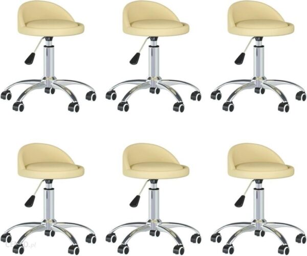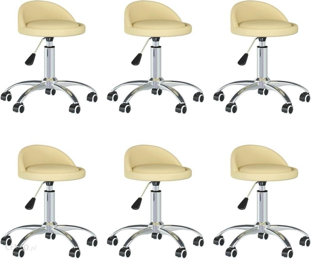 Obrotowe krzesła stołowe o stylowym i nowoczesnym wyglądzie będą praktycznym dodatkiem do Twojej przestrzeni mieszkalnej.Obite sztuczną skórą krzesła z pewnością zapewnią Ci optymalny komfort siedzenia. Podnośnik gazowy umożliwia regulację wysokości siedziska. Meble obracają się swobodnie o 360 stopni, a kółka pozwalają wygodnie się przemieszczać. Ponadto wspierają się one na chromowanej stali, co gwarantuje większą stabilność.Kolor: kremowyMateriał: sztuczna skóra (60% poliuretan, 30% poliester, 10% bawełna), chromowana stalWymiary całkowite: 36 x 38 x (54,5-66,5) cm (szer. x gł. x wys.)Możliwość obrotu o 360 stopniPodnośnik pneumatyczny Łatwe przemieszczanie dzięki 5 skrętnym kółkomRegulacja wysokości: takWymagany montaż: takZawartość przesyłki:6 x krzesło stołowe